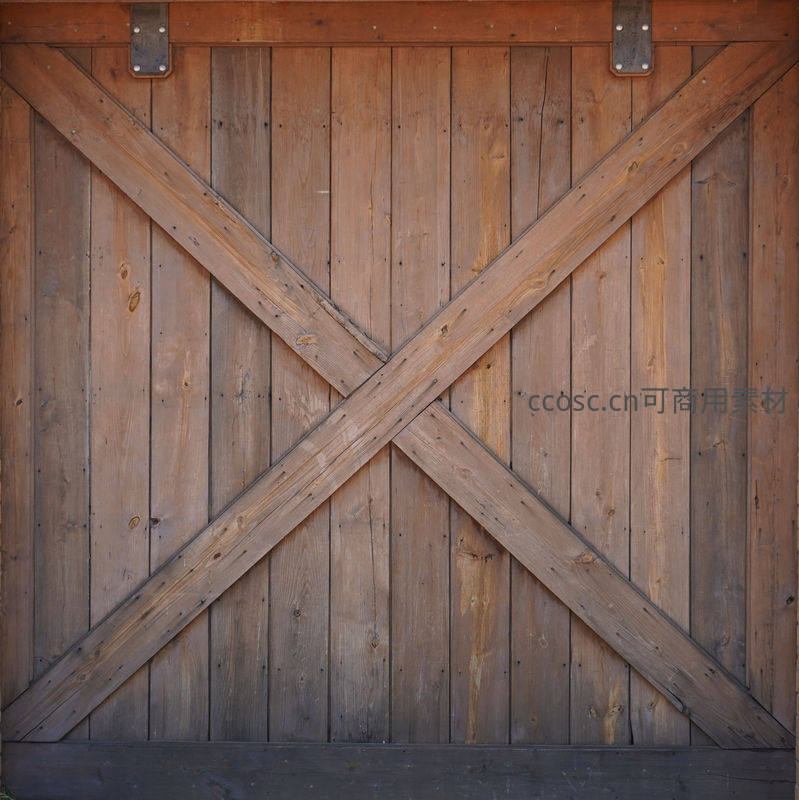一扇经典的乡村风格木制谷仓门,采用X形交叉木梁加固结构,木材纹理清晰,金属合页和铆钉细节彰显其坚固与实用之美。