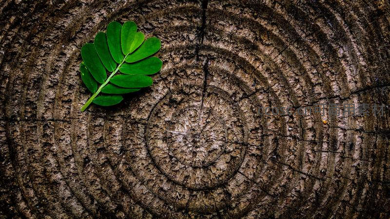绿叶静卧树桩年轮之上,生命与时间的诗意对话