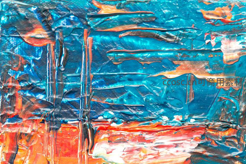 此作以流动的蓝色为主导,点缀温暖的橙红,颜料在画布上自然流淌、堆积,形成如水波般的肌理效果,营造出梦幻而富有诗意的抽象视觉体验。