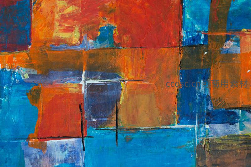 画面中红色、蓝色与棕色几何块面交错叠加,粗犷笔触与细腻过渡并存,营造出富有节奏感与空间层次的艺术氛围,极具装饰性。