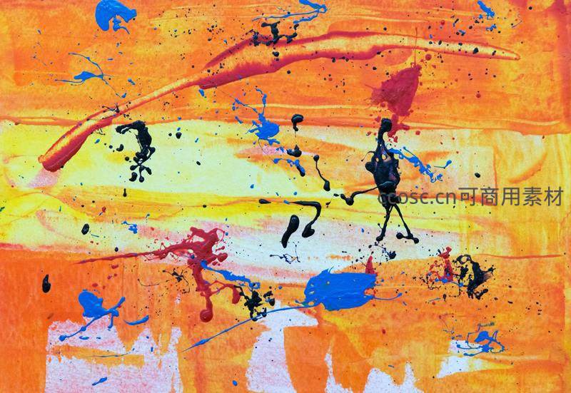 橙黄背景上肆意泼洒的蓝、黑、红颜料,形成如烟花绽放般的视觉爆炸效果,展现艺术家即兴创作时的激情与无拘无束的表达力量。