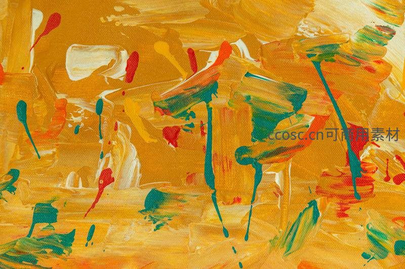 在温暖的金色底色上,绿、红、白等颜料如雨滴般自然流淌,形成动态而富有节奏感的画面,充满即兴创作的魅力。