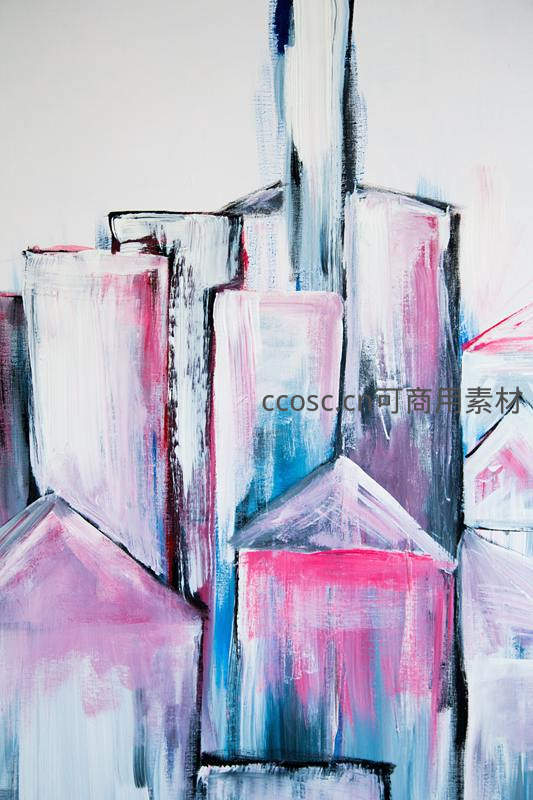 以粉色、蓝色和白色描绘的抽象城市天际线,简约的几何形态与柔和的色彩搭配,呈现出梦幻般的都市意象。