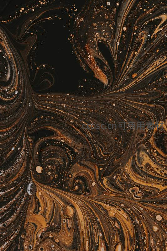 深邃的黑色背景上,金色与棕色的颜料如熔岩般流动、交融,形成充满动感与神秘感的抽象图案,适合作为高端设计背景。