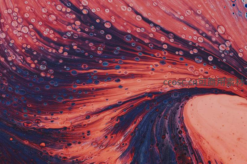 炽热的橙红与深邃的靛蓝如潮汐般涌动,无数大小不一的透明气泡点缀其间,赋予画面生命力与节奏感,引人遐想。