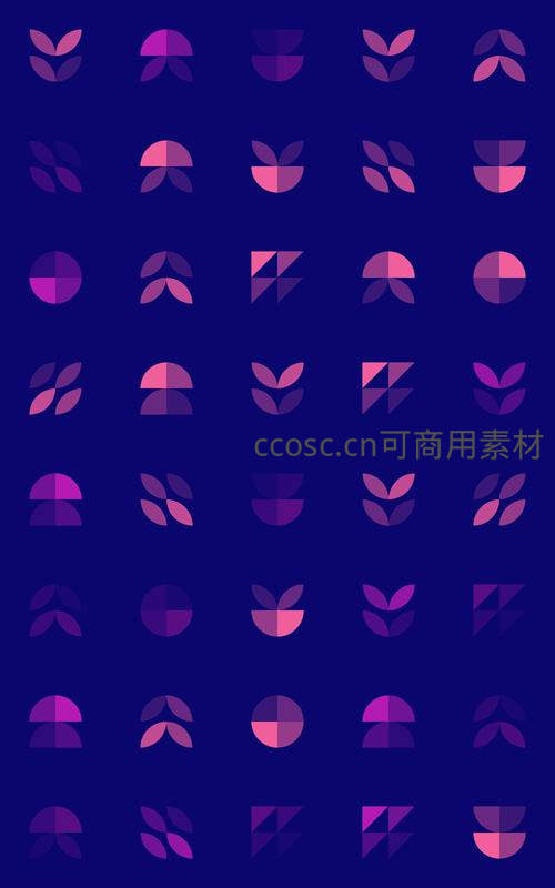 在深邃的蓝紫色背景上,一系列由半圆和叶片形状组成的几何图标以规律网格排列,色彩从紫到粉渐变,呈现出和谐统一的现代平面设计美感。