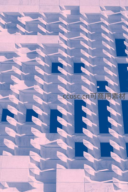 通过独特的视角捕捉现代建筑外墙的立体几何结构,光影交错形成强烈的视觉韵律,展现建筑美学与空间秩序感。