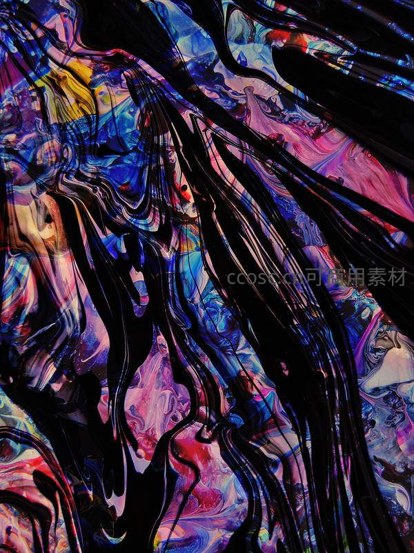 浓烈的黑色线条如丝带般穿梭于绚烂的彩色背景中,营造出神秘而迷幻的空间感,充满张力与想象力。