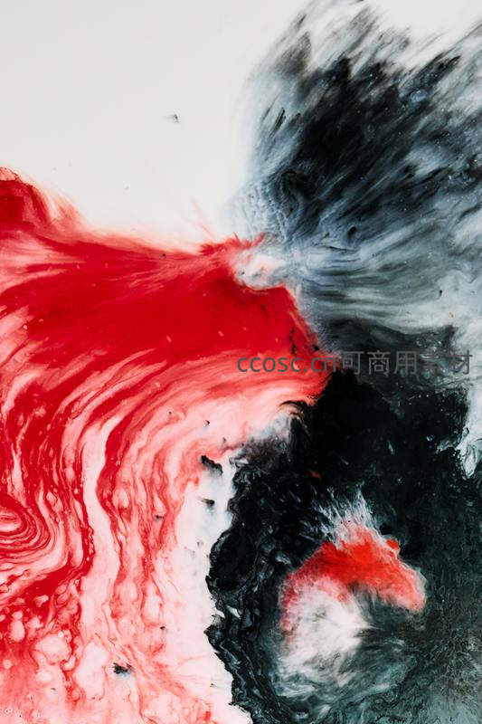 红与黑的颜料在白色背景上激烈碰撞,形成如烟似雾的流动纹理,充满视觉冲击力与艺术张力。