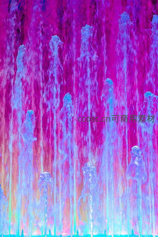 绚丽的霓虹灯光照亮喷泉,水柱在紫粉蓝光中飞溅,营造出梦幻般的视觉盛宴,是城市夜景中充满活力的艺术装置。