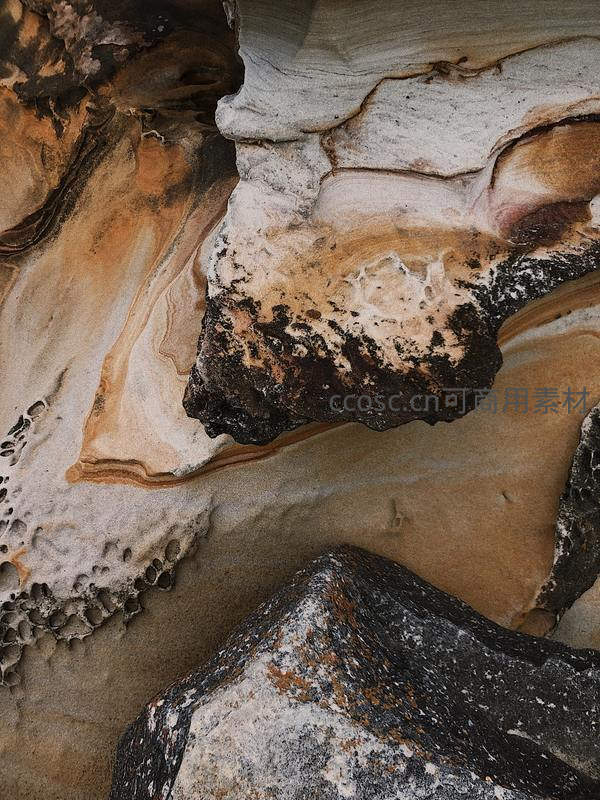 近距离捕捉岩层的细腻纹理,棕、白、黑等色彩交织,记录了地质变迁与风化作用,展现大自然鬼斧神工的雕塑艺术。