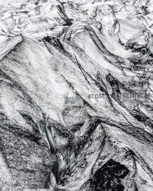 高空视角下的冰川表面布满深邃裂隙,黑白影调强化了其苍凉与壮阔,仿佛凝固的时光,诉说着地球最纯净角落的故事。