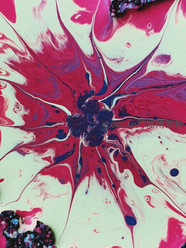 深红色与乳白色颜料在中心猛烈碰撞,如花朵般向四周放射出流畅的触手,深蓝与紫色点缀其间,营造出强烈的视觉张力。