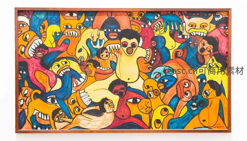 画布上密集堆叠着扭曲夸张的人物与怪物面孔,色彩浓烈对比强烈,传达出混乱、恐惧与原始情感的超现实表达。