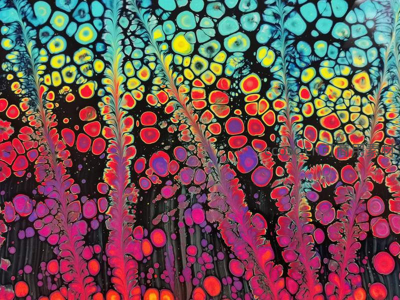 这幅作品以流体艺术技法呈现,色彩在画布上自由流淌、碰撞与融合,形成如梦似幻的视觉奇观,充满动感与生命力。