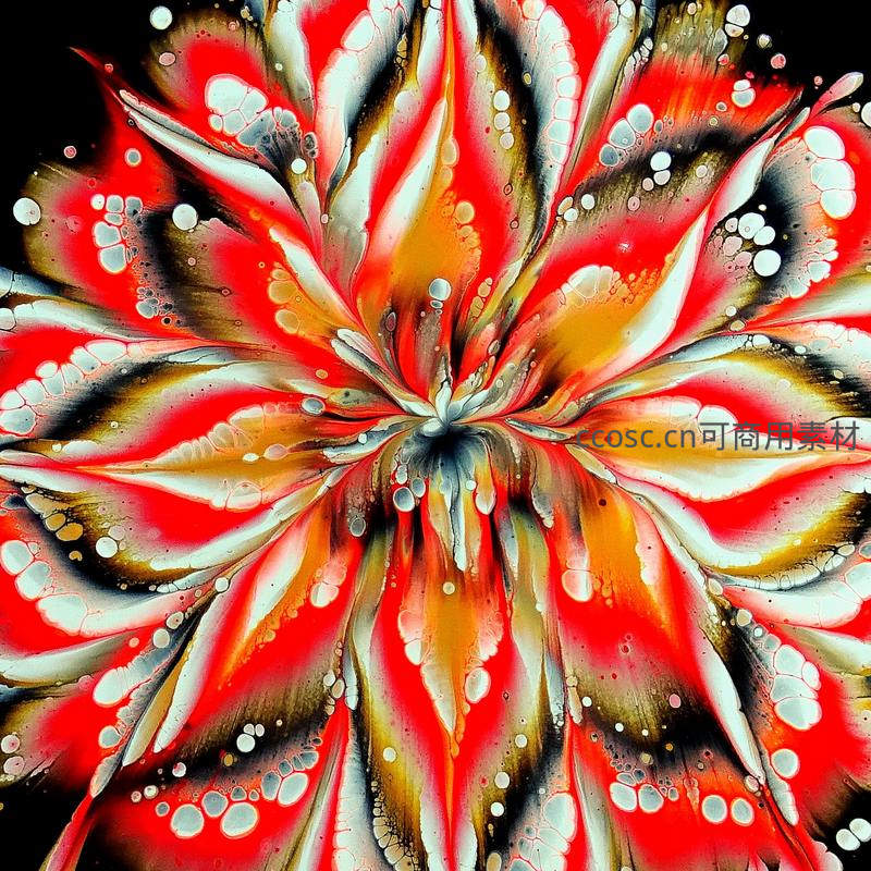 炽热的红色花瓣如火焰般向外迸发,点缀着白色气泡与黑色边缘,形成强烈对比,象征生命能量的爆发与燃烧。
