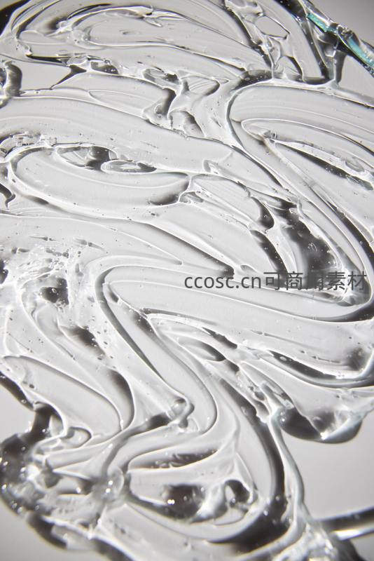 微距镜头下,透明凝胶在平面上自然流淌,形成蜿蜒的波纹与光影交错的立体质感,展现液体形态的动态美感。