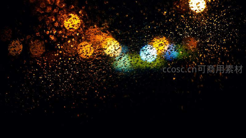 透过布满雨滴的车窗,远处的城市灯光被晕染成一个个温暖而迷离的光斑,营造出一种宁静又略带忧郁的都市夜景氛围。