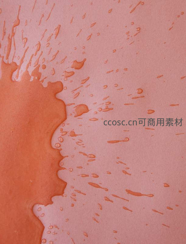 橙红色液体在浅粉色纸面上自然流淌、飞溅,形成不规则的边缘与斑点,呈现出充满动感与艺术感的抽象视觉效果。
