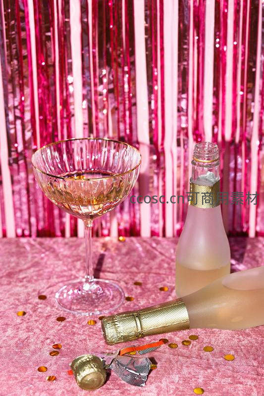 粉色丝绒桌布上摆放着香槟杯和酒瓶,背景是闪亮的粉色流苏幕布,金色纸屑点缀其间,营造出温馨浪漫的庆祝氛围。