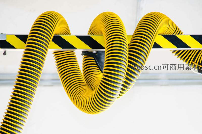 黄色与黑色相间的波纹软管在工业环境中蜿蜒缠绕,背景是醒目的黑黄警示条,体现工业安全与设备布局的视觉美感。