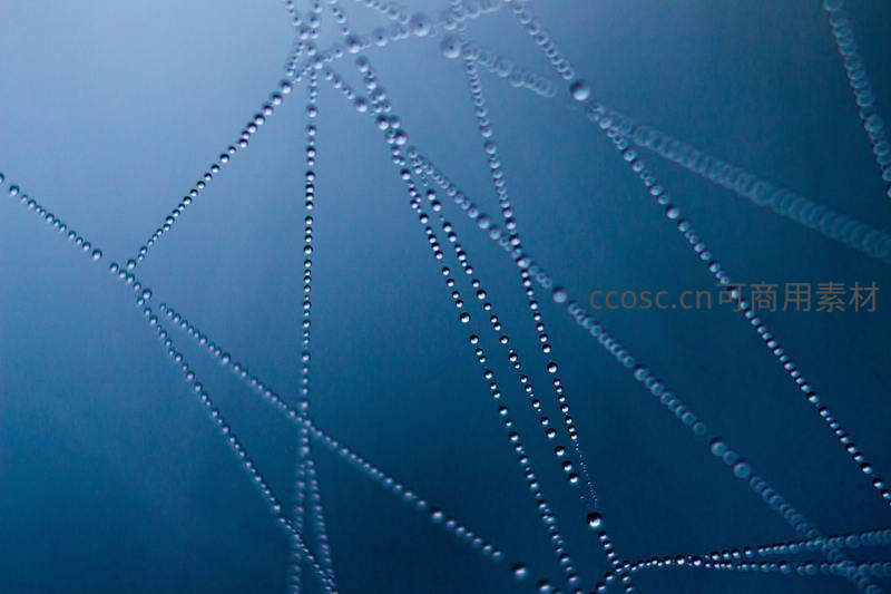 在柔和蓝调背景下,一张精密的蛛网挂满晶莹剔透的露珠,每一滴水珠都折射着光线,展现自然界微观世界的宁静与精致之美。