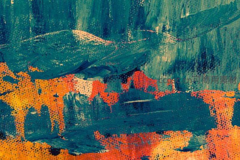 深邃的青绿色块与跳跃的橙红色斑点激烈碰撞,粗犷的笔触和颗粒质感共同构建出一个充满张力与原始能量的抽象世界。
