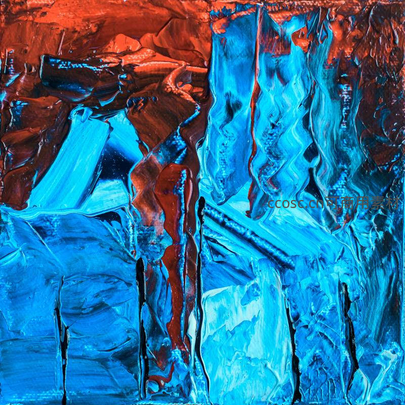 浓烈的蓝色与炽热的红色在画布上激烈碰撞,厚重的油彩堆叠出丰富的肌理感,展现出强烈的视觉冲击力和情感张力。