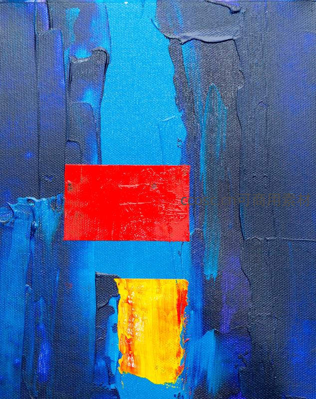 这幅抽象画以深邃的蓝色为基调,大胆运用鲜红和明黄的几何色块形成强烈视觉冲击,厚涂技法赋予画面丰富的肌理质感。