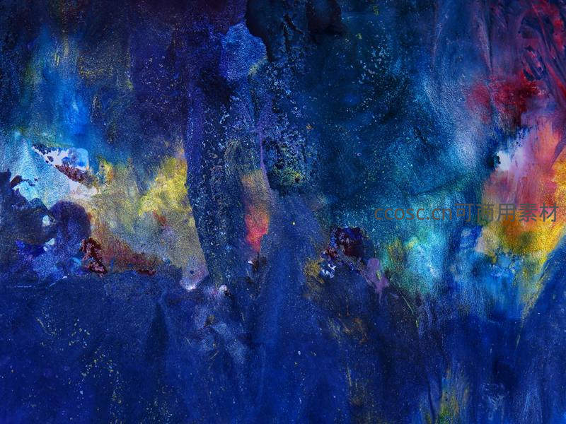 深邃的蓝色调与金色、红色斑点交织,营造出如宇宙星云般神秘梦幻的视觉效果,充满艺术想象力。