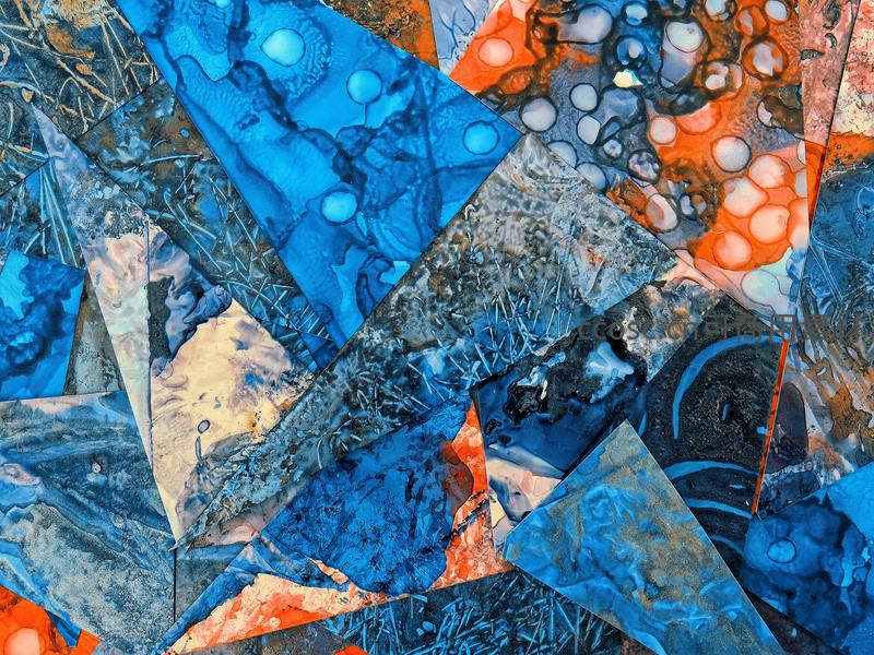 多块不规则几何形状的流体画作被切割重组,蓝色、橙色与灰色交织,形成充满动感与层次感的马赛克式视觉效果,富有现代艺术气息。