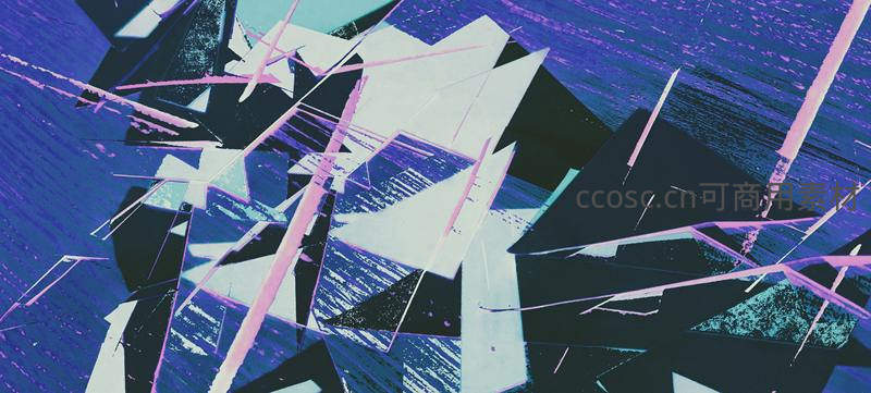 在深邃的蓝色背景下,白色与黑色的几何碎片被粉色的锐利线条切割、贯穿,形成一种破碎而又充满张力的现代抽象美学。