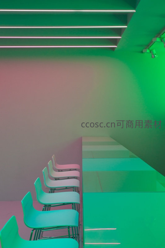 通体绿色的灯光笼罩着楼梯与座椅区域,呈现出一种宁静而前卫的视觉感受,强调了空间的线条与纯粹色彩。