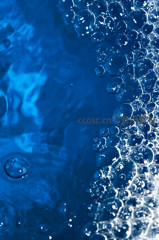 画面右侧是密集洁白的泡沫,左侧则是深邃的蓝色水体,两者交汇处形成了鲜明对比,泡沫的细腻质感与水的流动感共同营造出清新的氛围。