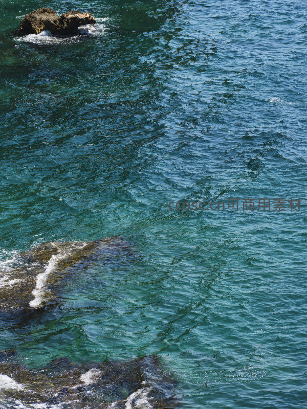 清澈碧绿的海水轻拍着嶙峋的礁石,激起朵朵白色浪花,展现了海岸线壮丽而富有动感的自然风光,令人心旷神怡。