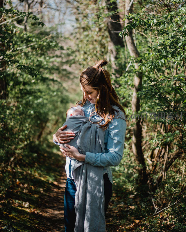 一位母亲在绿意盎然的林间小径上,用背巾温柔地抱着熟睡的新生儿。阳光透过树叶洒下斑驳光影,整个场景宁静而美好,充满了初为人母的幸福与自然的诗意。