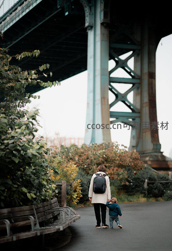 一位母亲牵着孩子在桥下的林荫小道上散步,周围绿植环绕,秋意渐浓,画面温馨宁静,充满生活气息。
