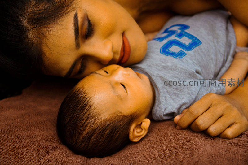 母亲侧卧轻吻熟睡中的婴儿,婴儿穿着印有数字的灰色上衣,两人依偎在棕色毯子上,画面捕捉了最温柔的亲子时刻,充满宁静与爱。