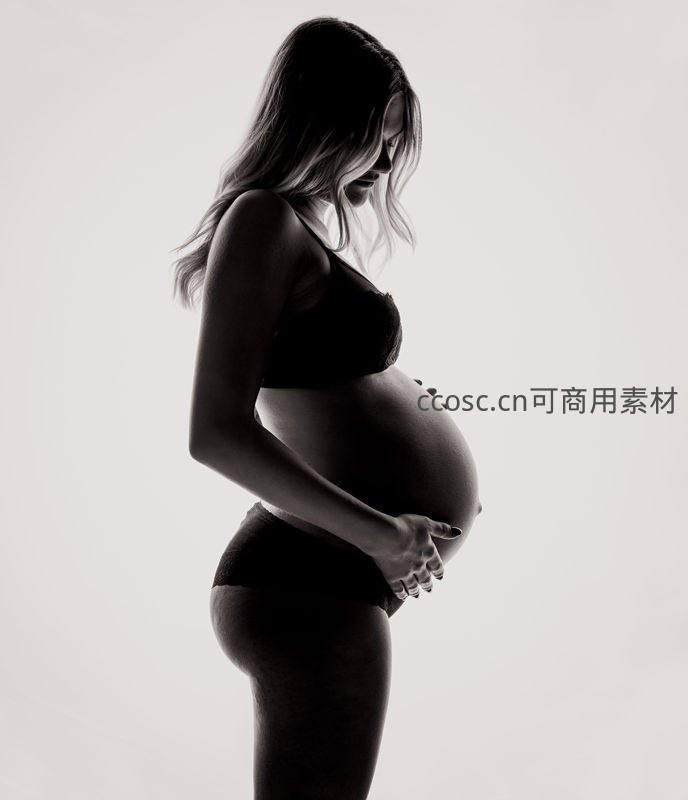 黑白孕妈侧影轻抚孕肚