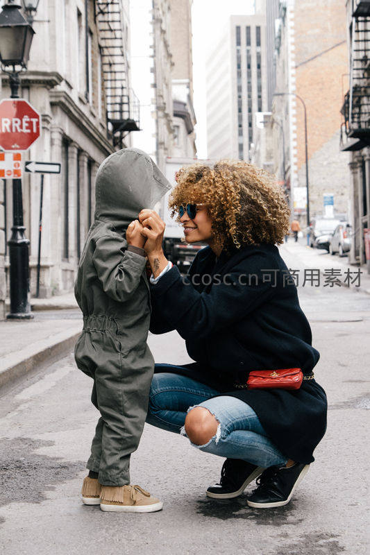 城市街头母子互动,卷发妈妈为孩子整理帽衫