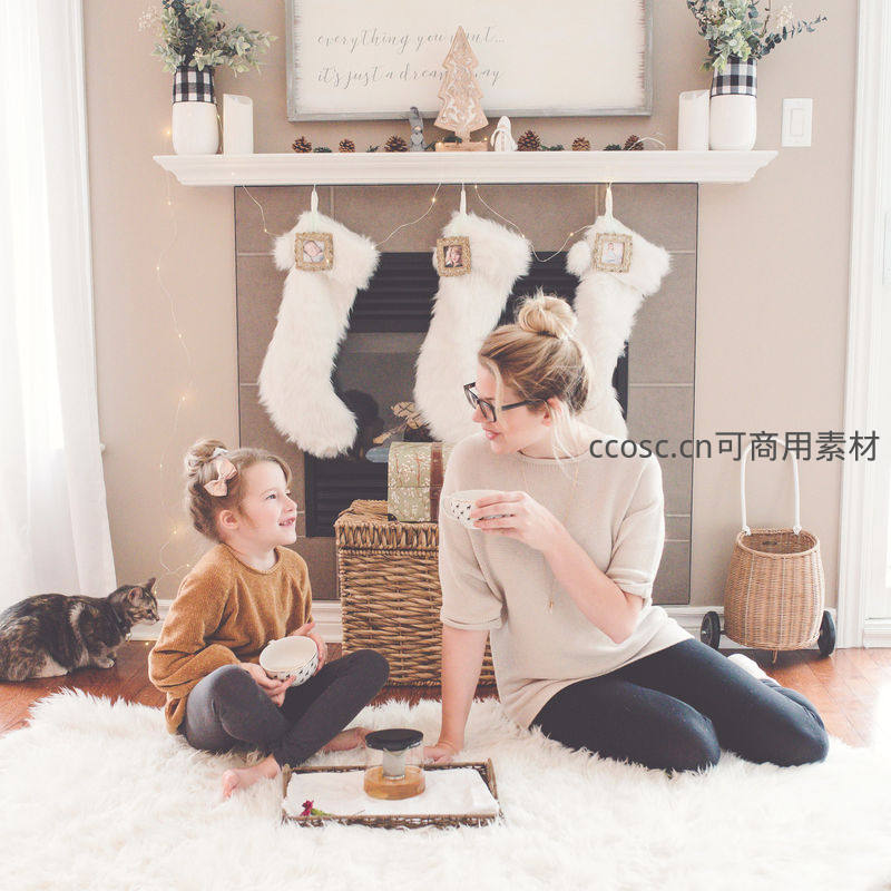 母亲与女儿坐在柔软的地毯上,围绕着装饰有圣诞袜的壁炉,享受一杯热饮,身旁猫咪相伴,满是节日的暖意。
