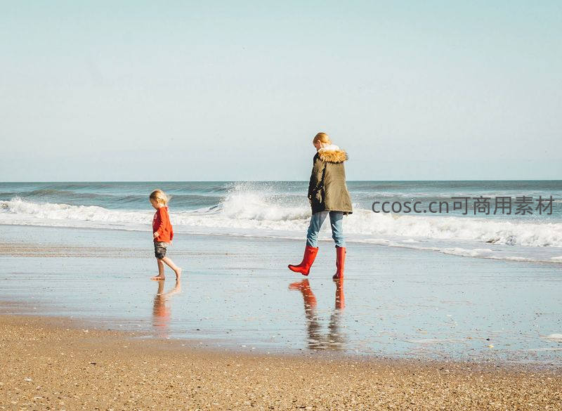 母亲穿着绿色外套和鲜红雨靴,与穿橙色上衣的孩子一起在海边浅滩奔跑,浪花拍打脚踝,晴空万里,捕捉到亲子互动的快乐瞬间。