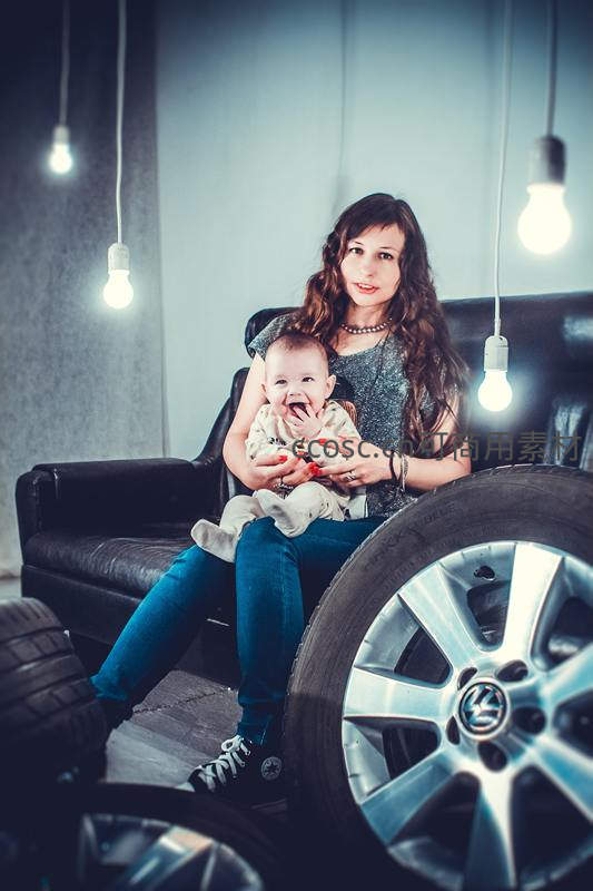 一位母亲坐在黑色沙发上,怀抱着微笑的婴儿,周围散落着汽车轮胎和悬挂的灯泡,营造出独特而温馨的家庭氛围。