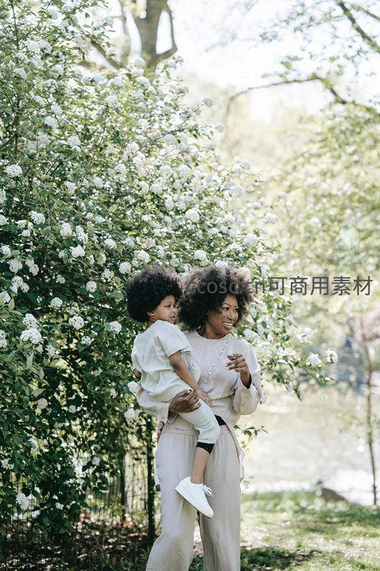 一位母亲怀抱孩子站在盛开的白色花丛旁,阳光透过树叶洒落,母子相视而笑,画面充满温暖与生机。