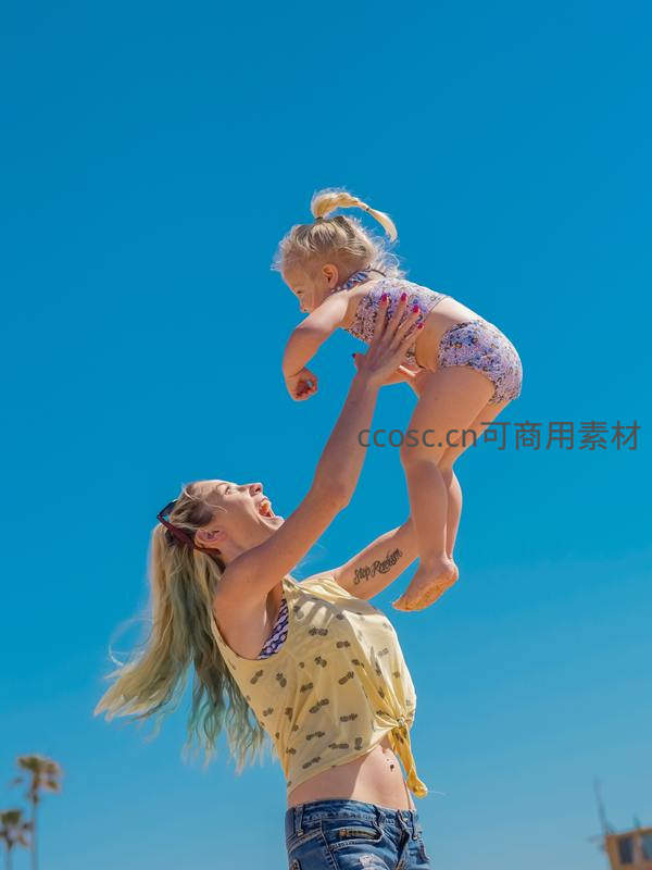 母亲在晴朗的蓝天下开心地将孩子高高抛起,孩子露出惊喜笑容,画面充满活力与无拘无束的亲子欢乐。