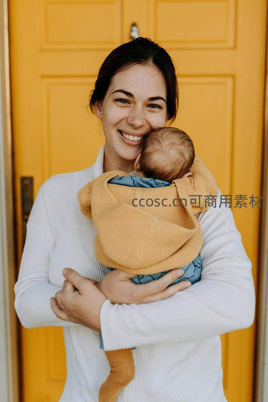 母亲身穿白色毛衣,怀抱裹在黄色襁褓中的新生儿,站在明亮的黄色门前展露灿烂笑容,温暖场景凸显初为人母的喜悦与满足感。