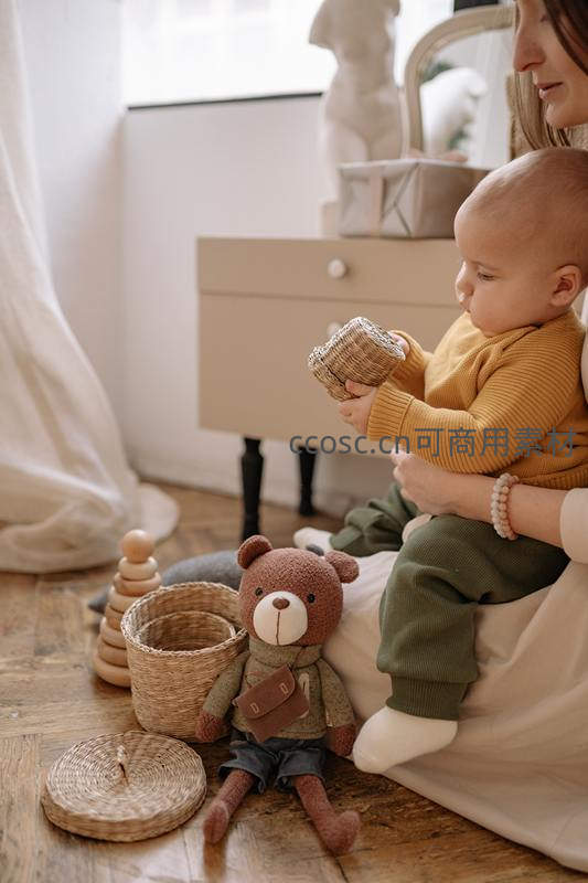 一个可爱的宝宝坐在母亲腿上,专注地摆弄着手中的编织小篮,身旁是毛绒泰迪熊和木制叠叠乐,整个画面充满宁静与温暖。