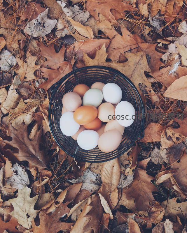 一个黑色铁丝篮盛满了色彩各异的新鲜鸡蛋,静静地置于铺满枯黄橡树叶的地上,营造出一种质朴、宁静又充满收获感的秋日田园景象。