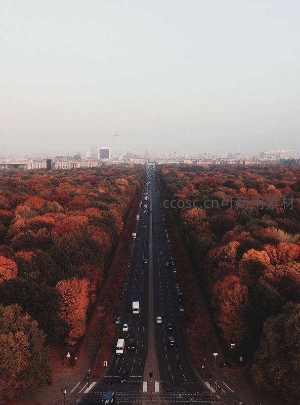 从高空俯瞰柏林一条笔直的林荫大道,两旁树木在秋季染成绚烂的红色与橙色,车辆在道路上有序穿行,远处城市轮廓隐约可见。