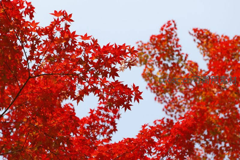 火红枫叶特写,蓝天映衬下尽显秋意浓